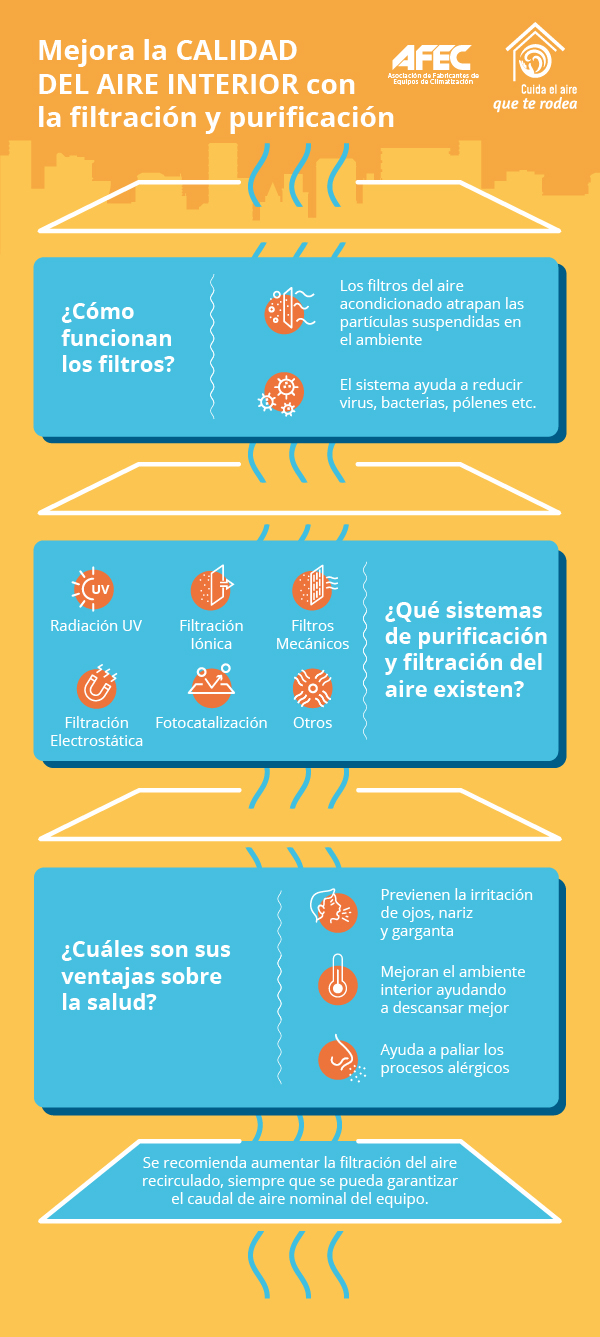 Madrid, 18 de Agosto de 2020. La filtración y la purificación son procesos clave para mejorar la calidad del aire interior, ya que contribuyen a la reducción de partículas y contaminantes que se encuentran en el aire que respiramos. Por eso dentro de la campaña ¡Cuida el Aire que te Rodea! de AFEC, en esta infografía se destaca la siguiente información sobre su importancia:
