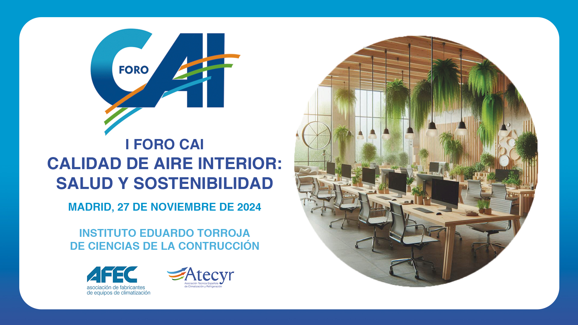 Atecyr y AFEC organizan el I Foro CAI, un evento gratuito que coincide con el día mundial de la Calidad del Aire Interior, el próximo 27 de noviembre el Instituto Eduardo Torroja de Madrid.